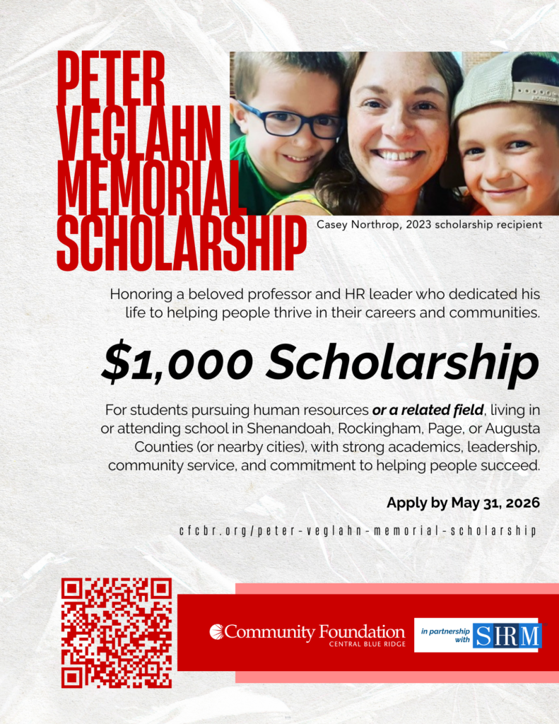 The Peter Veglahn Memorial Scholarship was established to provide funds for college scholarships to college students pursuing a career in human resources. The successful candidate must reside or attend school in the SVSHRM membership area of Shenandoah, Rockingham, Page and Augusta Counties, including the cities within those Virginia counties.